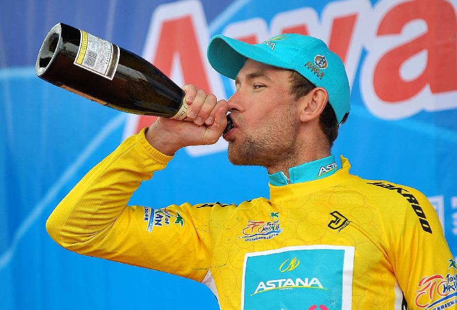 Kazakhstan 's Dmitriy Gruzdev from Astana drinks champagne on the podium after the last stage of the 2012 Tour of Hainan International Road Cycling Race in Sanya, south China's Hainan Province, Oct. 28, 2012. Dmitriy Gruzdev of Astana claimed the title after the final stage with a time of 34 hours 12 minutes 33 seconds in general standing. |