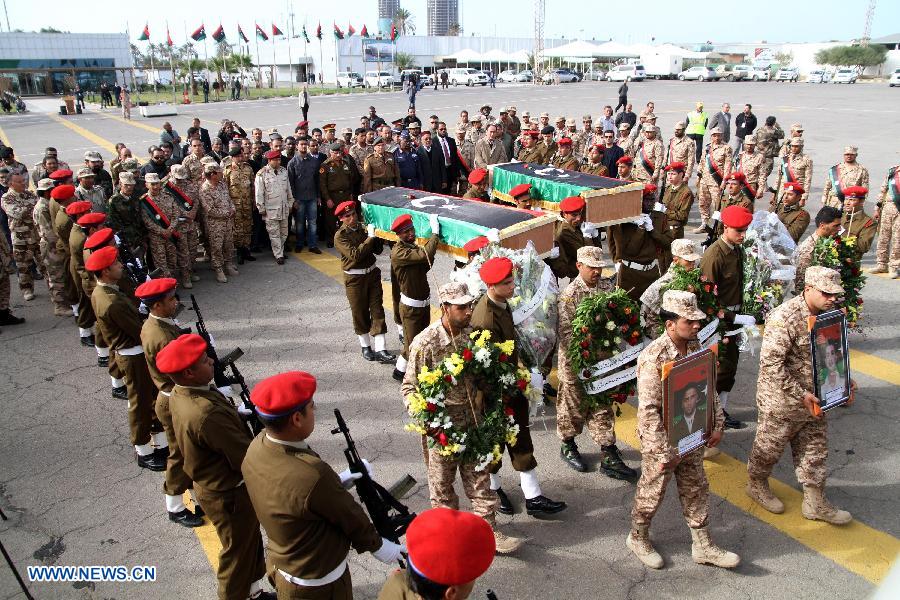 A memorial service is held in Dahra district of central Bani Walid, about 180km southeast of Tripoli, Libya, Dec. 16, 2012. Three members of the Libyan national army were killed and nine others wounded in an armed attack Saturday night in the city of Bani Walid, an army spokesman told Xinhua. [Xinhua]