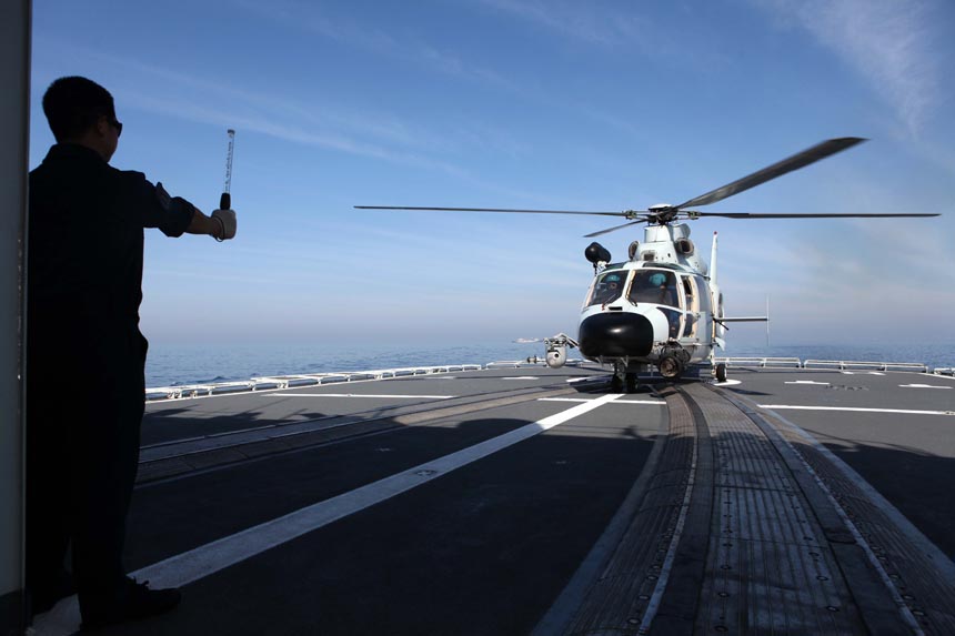 A carrier-based helicopter gets ready to take off during a combat rescue drill of China's 14th escort fleet on March 10 in the Arabian Sea. [Photo/Xinhua]