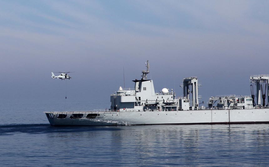 Navy commandos board a "hijacked" commercial ship, which is played by the supply ship Weishanhu, during a combat rescue drill of China's 14th escort fleet on March 10 in the Arabian Sea. [Photo/Xinhua]