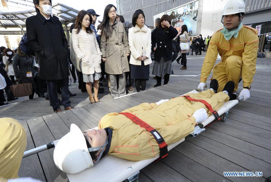 Workers show medical emergency measures during a drill in Tokyo, capital of Japan, on March 11, 2013. A drill to take precautions against natural calamities including medical emergency and fire fighting drills was held here to mark the two year anniversary of the March 11 earthquke and ensuing tsunami that left more than 19,000 people dead or missing and triggered a nuclear accident the world had never seen since 1986. [Xinhua]