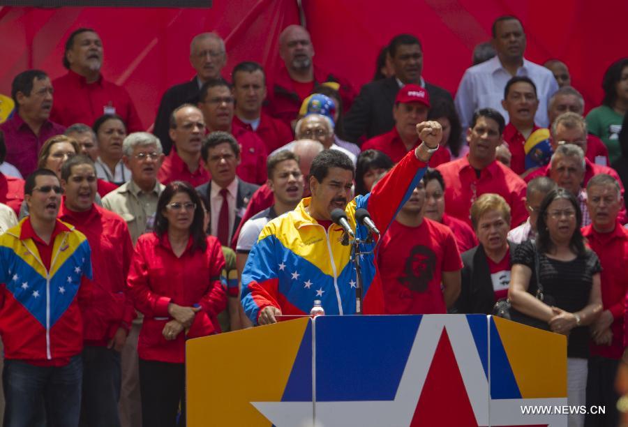Venezuela's acting President Nicolas Maduro (front) participates in a ceremony of his official registration as the ruling United Socialist Party of Venezuela (PSUV)'s candidate for presidential elections of April 14, at Venezuela's National Electoral Council (CNE) in Caracas, capital of Venezuela, on March 11, 2013. [Xinhua]
