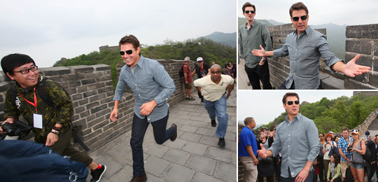 E-mail China.org.cn, May 10, 2013| American actor and producer Tom Cruise runs on the Great Wall in Beijing, capital of China, May 9, 2013. Cruise and director Joseph Kosinski arrived in China to promote their new movie "Oblivion", which will be released on May 10. [Chinanews.com] |