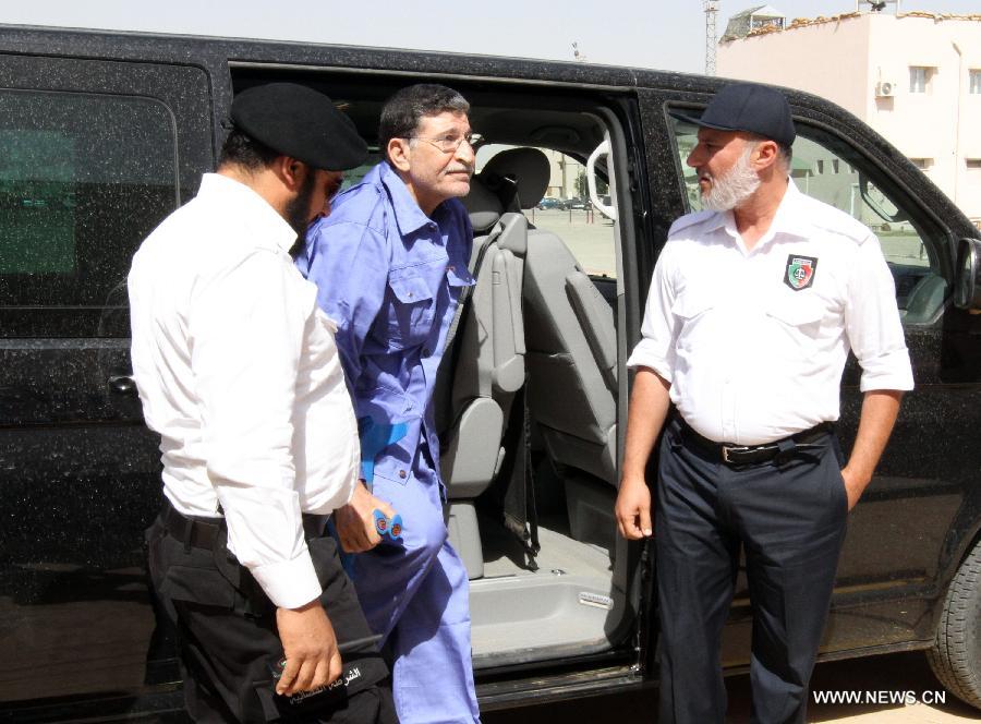 Former Libyan foreign intelligence chief Bouzid Dorda (C) arrives at a hearing in his trial in Tripoli on May 28, 2013. The former foreign intelligence chief, the first of Moamer Kadhafi's top officials to face justice, is accused of ordering security forces to use live ammunition against demonstrators last year. [Photo/Xinhua]
