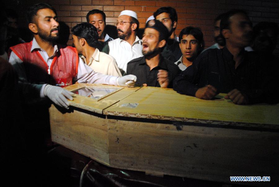 Rescuers transfer a body to a hospital in northwest Pakistan's Peshawar on May 28, 2013. Two female polio workers were killed when unknown gunmen attacked a polio-eradication team in Pakistan's northwest Peshawar city on Tuesday morning, local media reported. [Photo/Xinhua]
