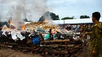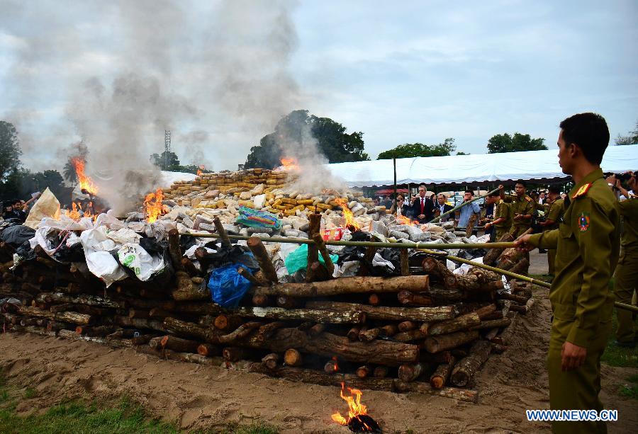 A policeman ignites drugs during a drug destruction ceremony in Vientiane, Laos, June 26, 2013. More than 2,500 kilograms of drugs were burnt during a drug destruction ceremony held in Vientiane on Wednesday. [Photo/Xinhua]