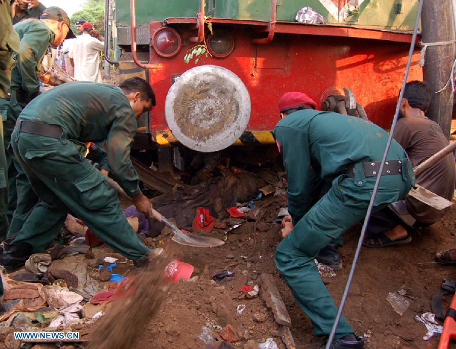 Rescuers work at the train accident site in eastern Pakistan's Gujranwala on July 25, 2013. At least three people were killed and several others injured when a train derailed here on Thursday, local media reported. [Xinhua]