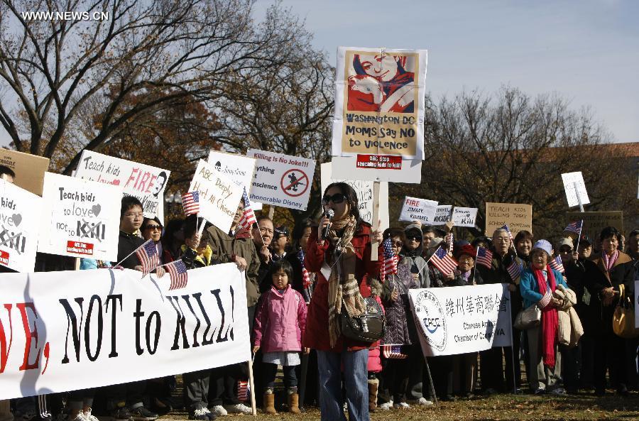 Chinese protesters gather during a protest against the rhetoric of racial discrimination of the American Broadcasting Company (ABC) in Washington D.C., Nov. 9, 2013. [Xinhua]