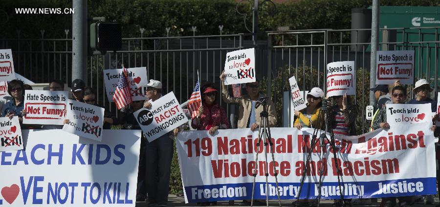 People rally in front of the headquarters of the American Broadcasting Company (ABC) to protest against its rhetoric of racial discrimination in Burbank, California, the United States, Nov. 9, 2013. [Xinhua] |