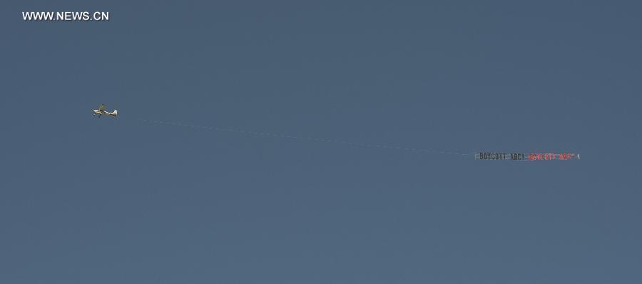 A plane flies with a banner saying "Boycott ABC!" over the headquarters of the American Broadcasting Company (ABC) to protest against its rhetoric of racial discrimination in Burbank, California, the United States, Nov. 9, 2013. [Xinhua] |
