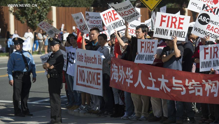 People rally in front of the headquarters of the American Broadcasting Company (ABC) to protest against its rhetoric of racial discrimination in Burbank, California, the United States, Nov. 9, 2013. [Xinhua]