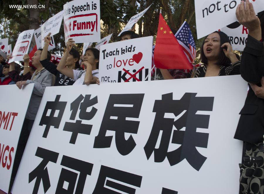 People rally in front of the headquarters of the American Broadcasting Company (ABC) to protest against its rhetoric of racial discrimination in Burbank, California, the United States, Nov. 9, 2013. [Xinhua]