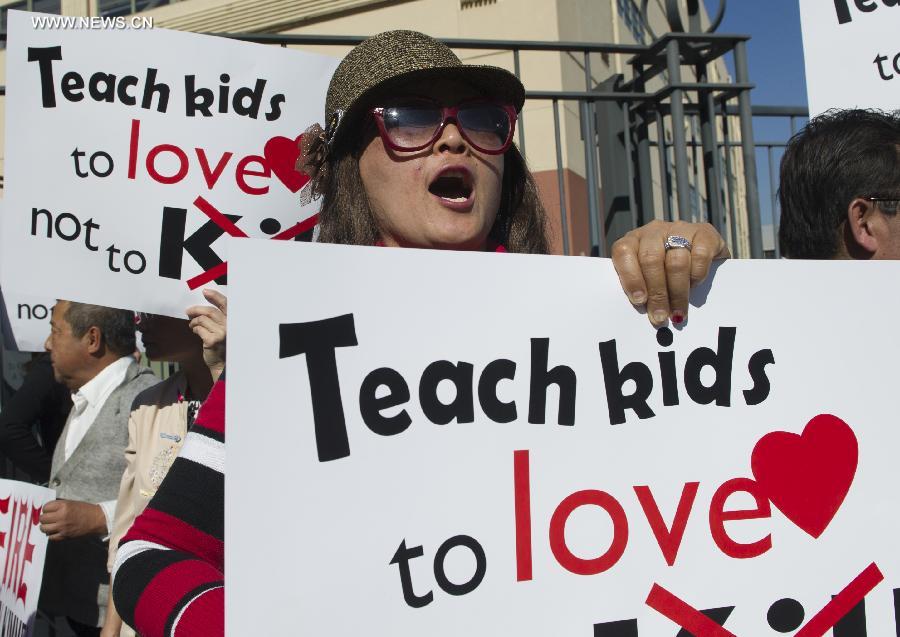 People rally in front of the headquarters of the American Broadcasting Company (ABC) to protest against its rhetoric of racial discrimination in Burbank, California, the United States, Nov. 9, 2013. [Xinhua]