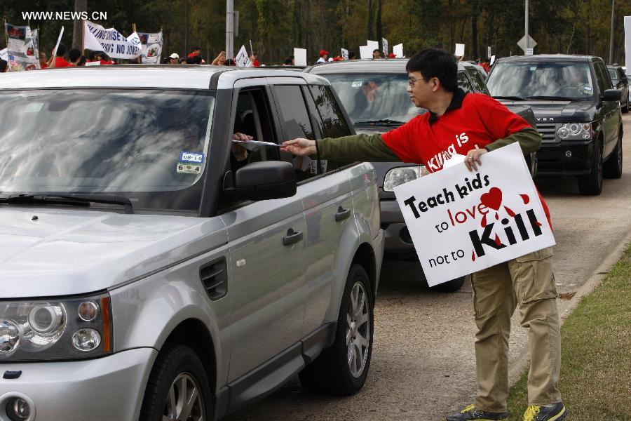 Chinese protesters gather during a protest against the rhetoric of racial discrimination of the American Broadcasting Company (ABC) in Houston, Nov. 9, 2013. [Xinhua]