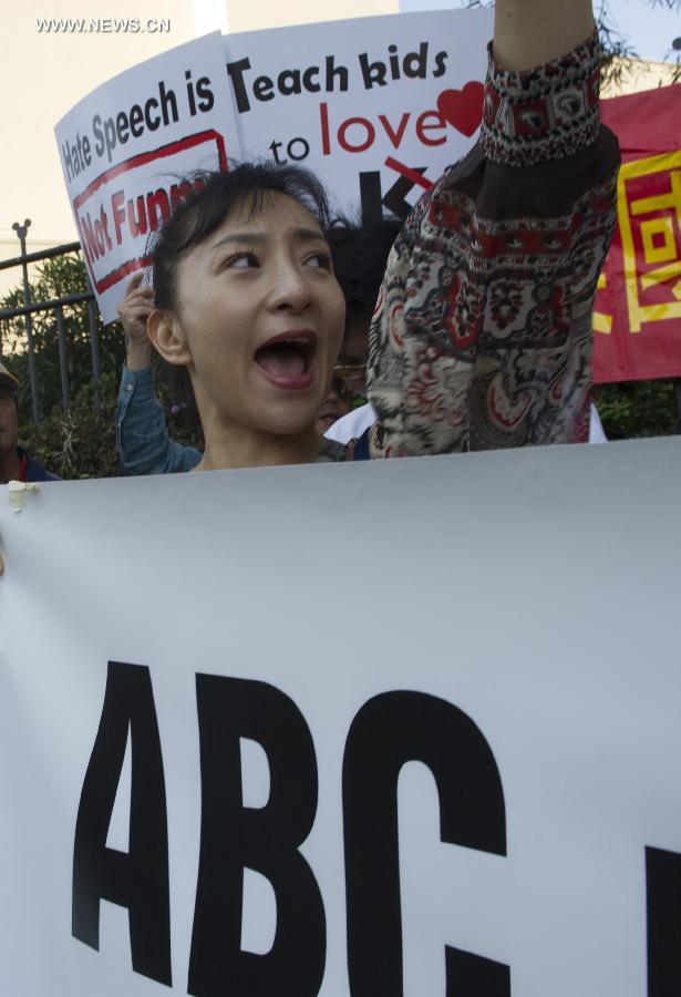 Luo Sandy shouts slogans during a rally in front of the headquarters of the American Broadcasting Company (ABC) to protest against its rhetoric of racial discrimination in Burbank, California, the United States, Nov. 9, 2013. [Xinhua] |
