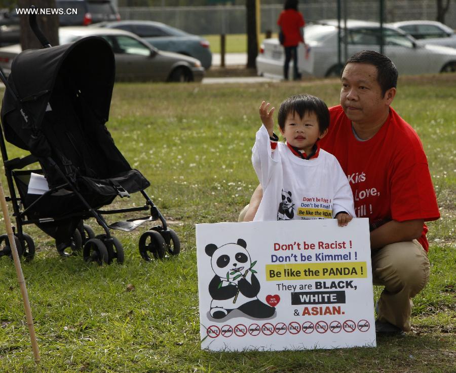 Chinese protesters gather during a protest against the rhetoric of racial discrimination of the American Broadcasting Company (ABC) in Houston, Nov. 9, 2013. [Xinhua]