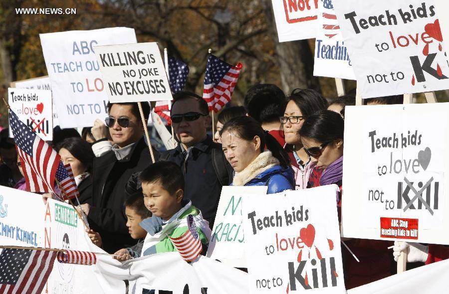 Chinese protesters gather during a protest against the rhetoric of racial discrimination of the American Broadcasting Company (ABC) in Washington D.C., Nov. 9, 2013. [Xinhua]