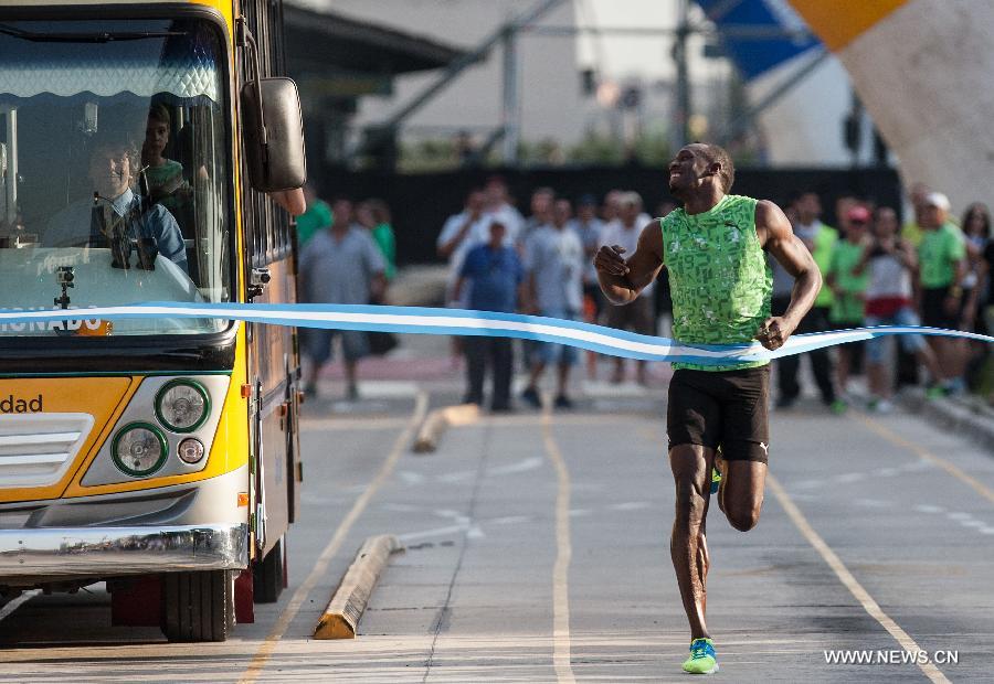 The Jamaican record-holder Usain Bolt (R) crosses the finish line after beating a bus in a race in the "9 de Julio" Avenue, in Buenos Aires, Argentina, on Dec. 14, 2013. Bolt performed different activities during his visit to Argentina with a talk about leadership, sporting clinics to kids in poverty and a race of 80 meters against a bus in the "9 de julio" Avenue. (Xinhua/Martin Zabala) |
