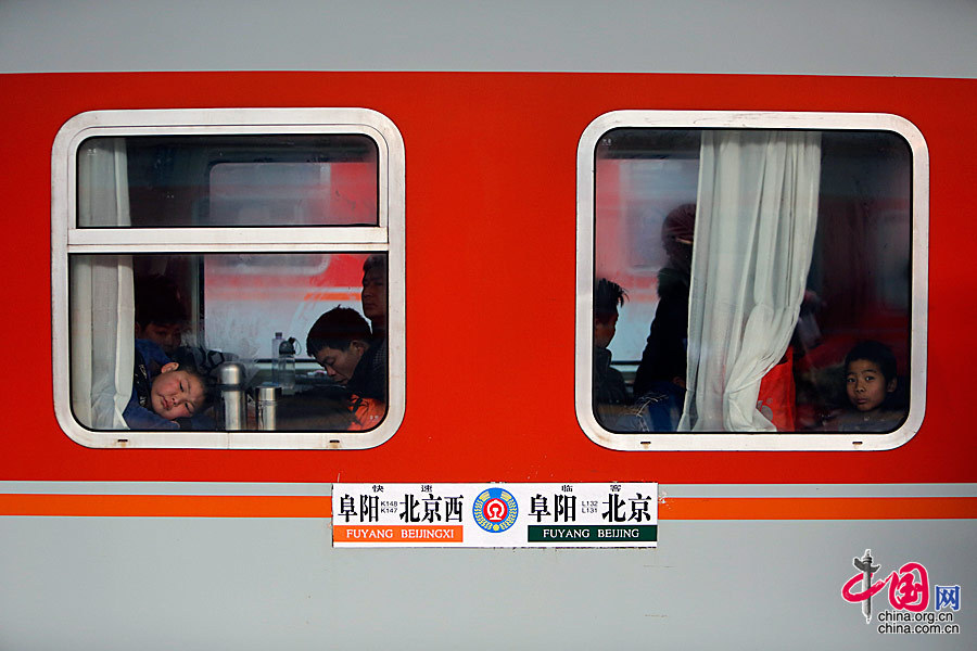 A train bound for Fuyang, Anhui Province, waits to depart Beijing West Railway Station on Jan. 16. [Photo by Yang Jia/China.org.cn]