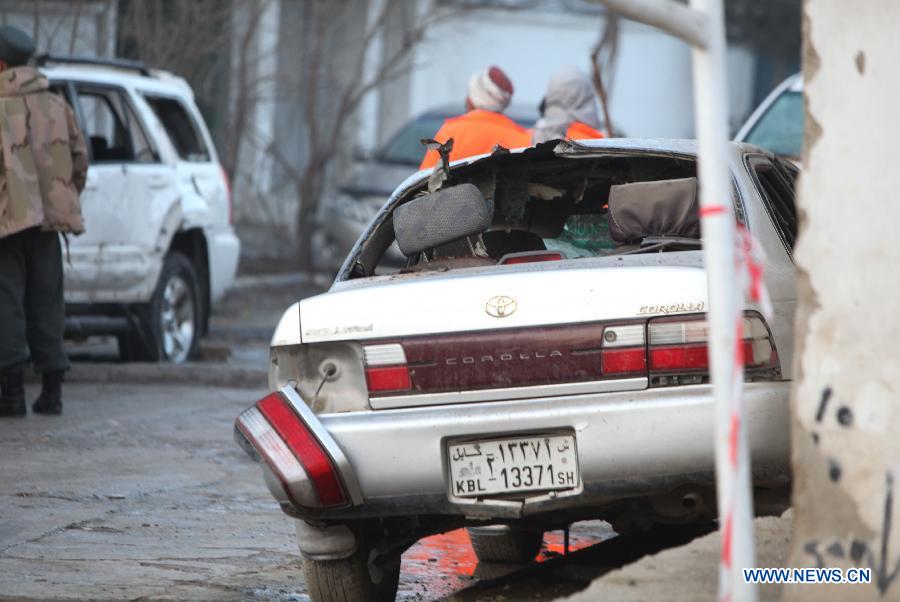 Photo taken on Jan. 18, 2014 shows a damaged car at the blast site in Kabul, Afghanistan. Twenty-one people, including 13 foreigners, were killed in Friday's terror attack at the Lebanese Restaurant in Afghan capital of Kabul, the Kabul police chief said Saturday. [Xinhua] |