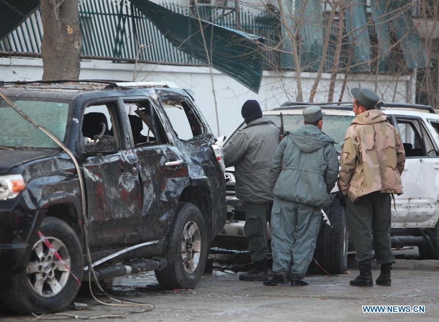 Afghan policemen inspect the site of an attack in Kabul, Afghanistan on Jan. 18, 2014. Twenty-one people, including 13 foreigners, were killed in Friday's terror attack at the Lebanese Restaurant in Afghan capital of Kabul, the Kabul police chief said Saturday. [Xinhua]