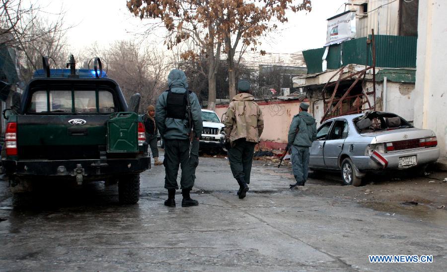 Photo taken on Jan. 18, 2014 shows a damaged car at the blast site in Kabul, Afghanistan. Twenty-one people, including 13 foreigners, were killed in Friday's terror attack at the Lebanese Restaurant in Afghan capital of Kabul, the Kabul police chief said Saturday. [Xinhua]
