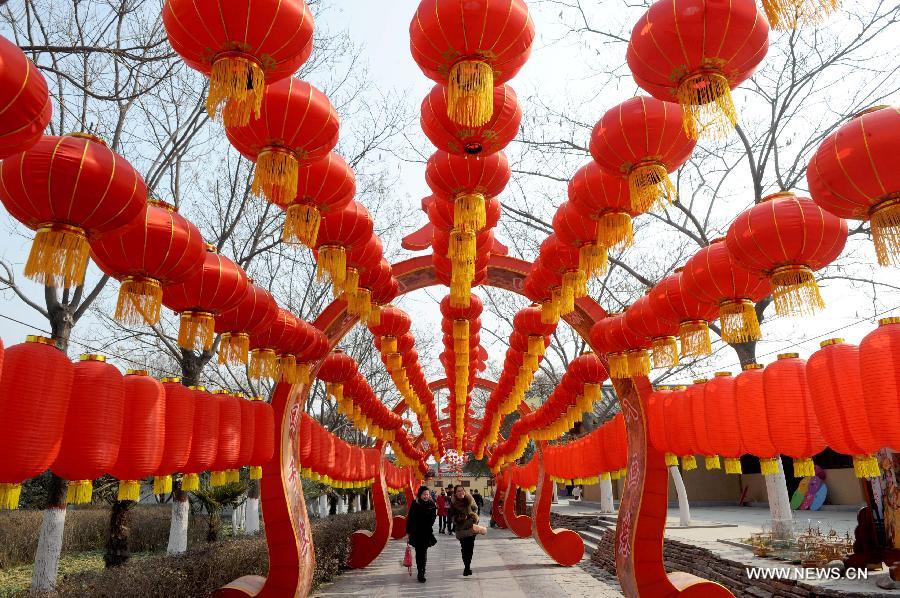 Red lanterns are hung to greet the upcoming Spring Festival which falls on Jan. 31 this year, in Kaifeng, central China's Henan Province, Jan. 26, 2014. (Xinhua/Zhu Xiang)