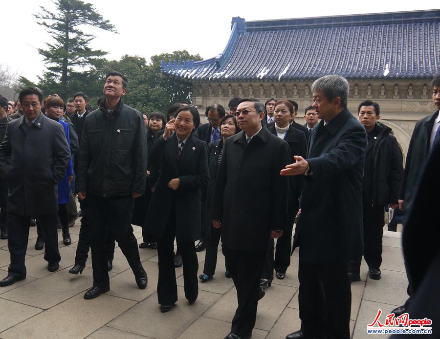 Wang Yu-chi (2nd, R), Taiwan's mainland affairs chief, visits Dr. Sun Yat-sen's mausoleum in Nanjing, capital of east China's Jiangsu Province, Feb. 12, 2014. [Photo/people.com.cn]