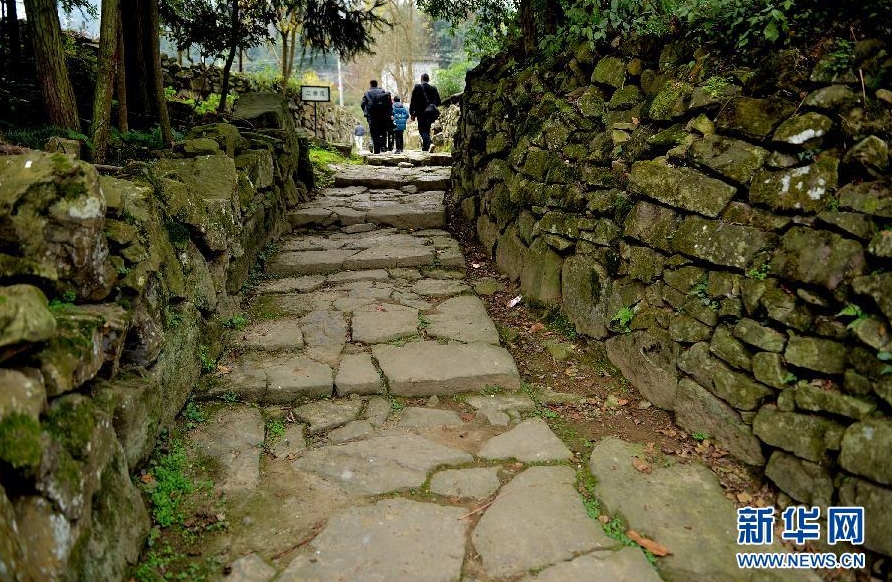 Visitors walk along the ancient road of the Tangya Tusi Site, located in Xianfeng County of Hubei Province, on Dec. 14, 2013. [Photo/Xinhua]
