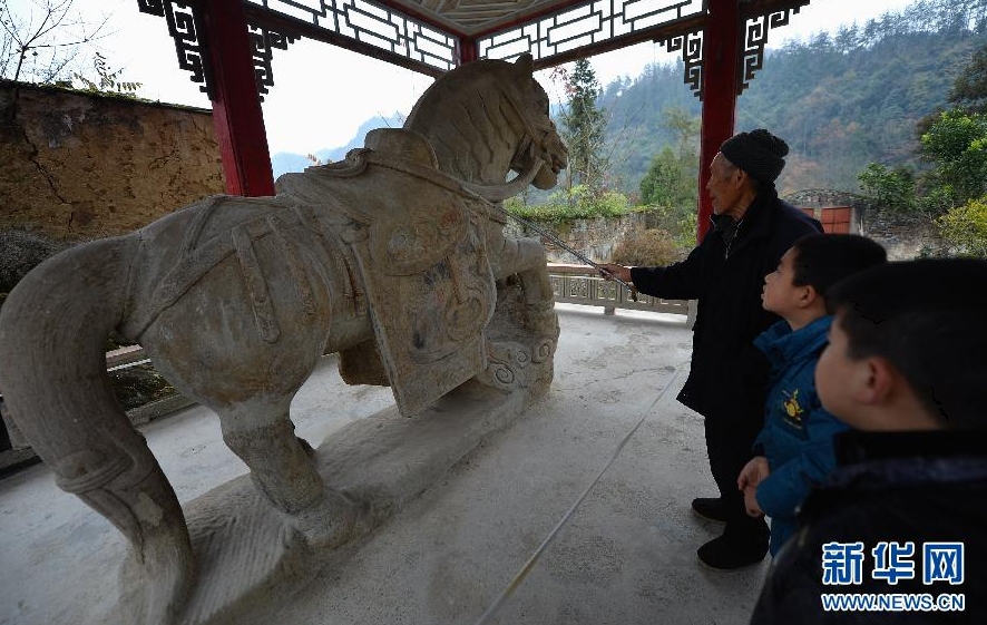 An 80-year-old local man introduces children to a stone horse at the Tangya Tusi Site, located in Xianfeng County of Hubei Province, on Dec.14, 2013. [Photo/Xinhua]