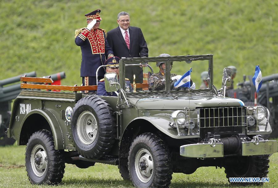 President of El Salvador, Mauricio Funes (R-Up), inspects the troops accompanied by Minister of National Defense, General David Munguia Payes (L-Up), during the celebration of the Soldier Day and the commemoration of the 190 anniversary of the founding of the Armed Forces, in San Salvador, capital of El Salvador, on May 7, 2014. [Xinhua]
