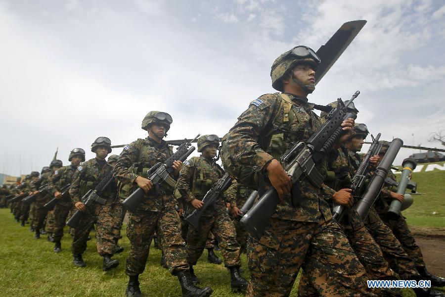 Soldiers take part in the celebration of the Soldier Day and the commemoration of the 190 anniversary of the founding of the Armed Forces, in San Salvador, capital of El Salvador, on May 7, 2014. [Xinhua]