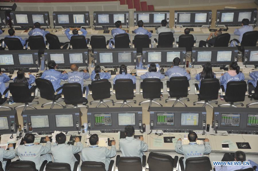 Technicians make the first adjustment to the test orbiter for lunar mission at the Beijing Aerospace Control Center, in Beijing, China, Oct. 24, 2014. The test orbiter made its first adjustment successfully at 4: 29 p.m. on Friday under technicians' accurate control. (Xinhua/Tian Zhaoyun)
