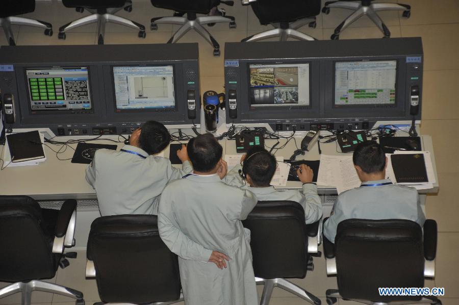 Technicians monitor the test orbiter for lunar mission at the Beijing Aerospace Control Center, in Beijing, China, Oct. 24, 2014. The test orbiter made its first adjustment successfully at 4: 29 p.m. on Friday under technicians' accurate control. (Xinhua/Tian Zhaoyun)