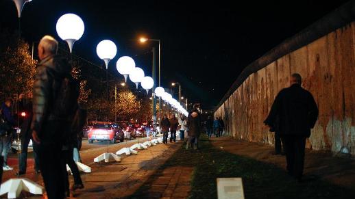 | Visitors view a light installation of balloons along the course of former Berlin Wall at a Berlin Wall memorial site in Berlin, Germany, on Nov. 8, 2014. Some 8000 luminous white balloons were set in Berlin from Nov. 7 to 9 to commemorate the 25th anniversary of the fall of the Berlin Wall. (Xinhua/Zhang Fan) |
