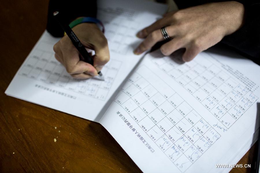 Xiao Xue (assumed name), a HIV carrier, registers to receive free medicine at Banan People's Hospital of Chongqing Municipality, southwest China, Nov. 9, 2014. Xiao is a volunteer of Chongqing Tongxin Workgroup, a non-governmental organization working on AIDS prevention, and also a HIV carrier. His dream is to open a pharmacy to help those HIV carriers. (Xinhua/Gu Yi)