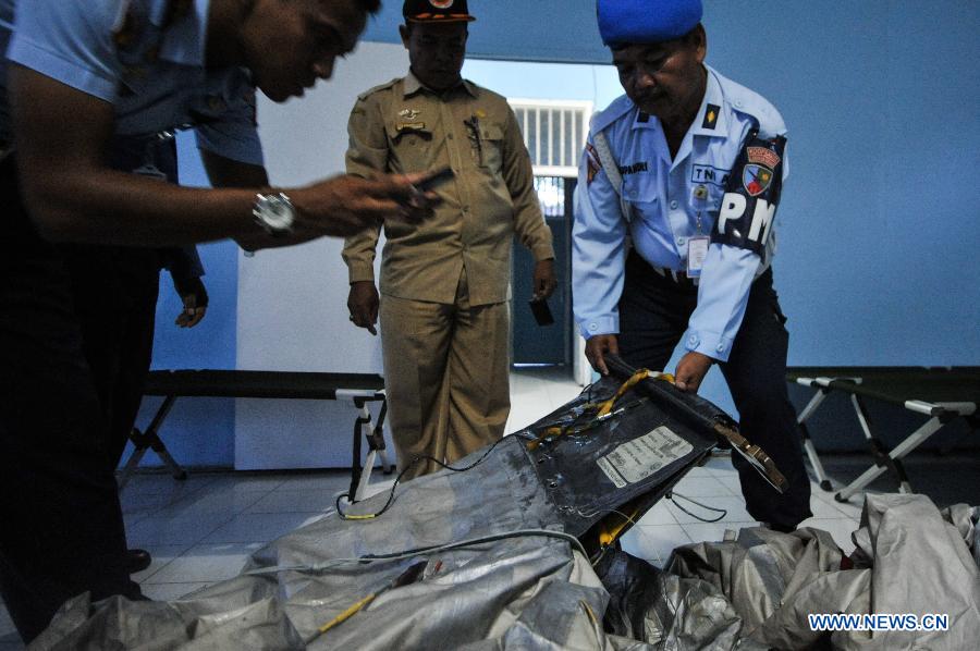 Officers display an object suspected as belongings of AirAsia QZ8501 that found on the sea of Karimata at Pangkalan Bun airport, Central Kalimantan province, Indonesia, on Dec. 30, 2014. Indonesian authorities have confirmed that the objects and corpses spotted are from the missing AirAsia plane and they will be brought to Pangkalan Aju in Pangkalan Bun of Central Kalimantan province, the nearest place to the location of the finding. [Photo/Xinhua]
