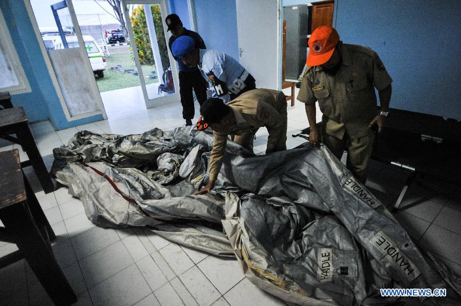 Officers display an object suspected as belongings of AirAsia QZ8501 that found on the sea of Karimata at Pangkalan Bun airport, Central Kalimantan province, Indonesia, on Dec. 30, 2014. Indonesian authorities have confirmed that the objects and corpses spotted are from the missing AirAsia plane and they will be brought to Pangkalan Aju in Pangkalan Bun of Central Kalimantan province, the nearest place to the location of the finding. [Photo/Xinhua]
