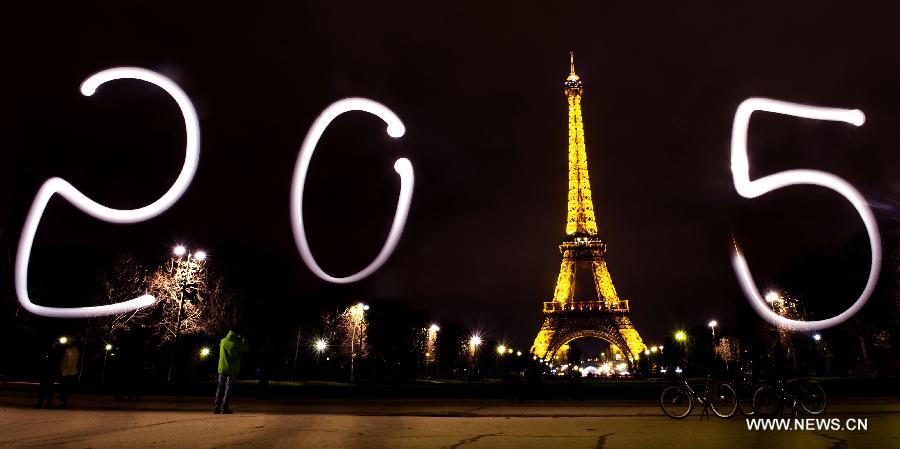 A tourist writes "2015" with a light pen in front of the Eiffel Tower in Paris, France, Dec. 30, 2014. [Photo/Xinhua]