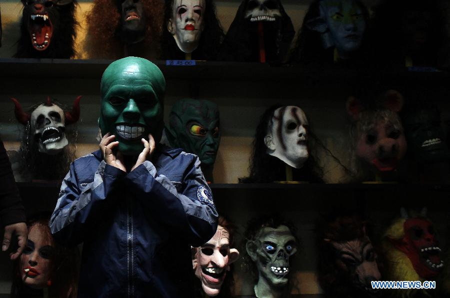 A man poses with a mask in a stand of masks for sale in the city of Quito, Ecuador, on Dec. 30, 2014. The figures made of paperboard will be set on fire as part of the local tradition to "burn" the old year so as to leave behind the negative experiences of last year and welcome the New Year. [Photo/Xinhua]