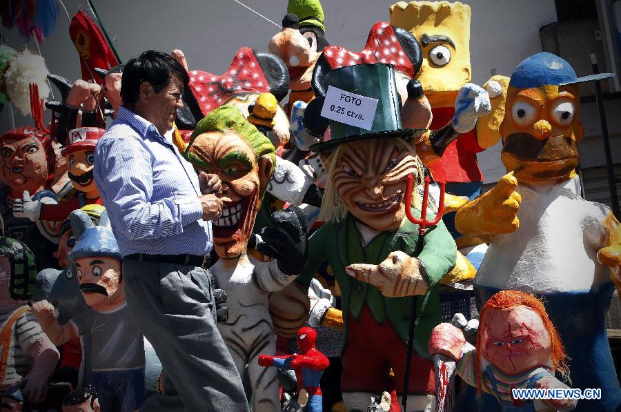 A man walks in front of figures of movie and TV characters shown for sale in the city of Quito, Ecuador, on Dec. 30, 2014. The figures made of paperboard will be set on fire as part of the local tradition to "burn" the old year so as to leave behind the negative experiences of last year and welcome the New Year. [Photo/Xinhua]