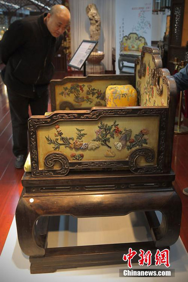 A throne belonging to Emperor Qianlong during the Qing Dynasty in the 1700's has sold for 5.15 million US dollars at auction in Nanjing, East China's Jiangsu Province. The throne, made of rosewood and inlaid with gold and a floral pattern, was owned by philanthropist Li Chunping. [Photo/Chinanews.com]