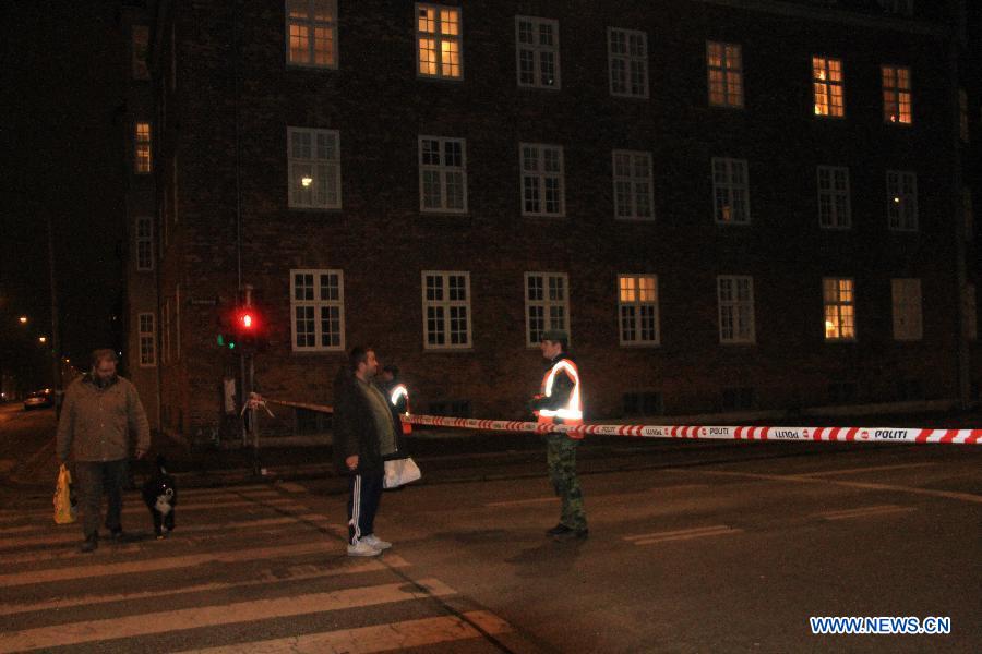 E-mail Xinhua, February 15, 2015| Soldiers cordon off the street near the shooting site in Copenhagen, Denmark, on Feb. 14, 2015. One man was killed and three police officers were wounded Saturday afternoon at a shooting in Danish capital of Copenhagen, police said. [Shi Shouhe/Xinhua] |