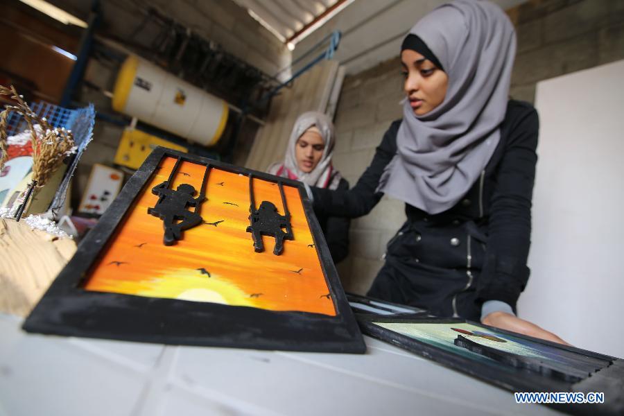 E-mail Xinhua, February 15, 2015| A Palestinian girl displays her painting at an atelier in the southern Gaza Strip city of Rafah, on Feb. 14, 2015. Three Palestinian artists use the remains of houses which were destroyed during the 51-day Israeli recent military campaign on Gaza Strip to form paintings and models, and will display them in a public gallery to show solidarity with owners of destroyed houses. [Khaled Omar/Xinhua] |