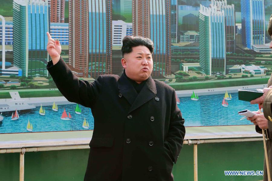 | Photo provided by Korean Central News Agency (KCNA) on Feb. 15, 2015 shows top leader of the Democratic People's Republic of Korea (DPRK) Kim Jong Un recently inspect the construction of the Mirae Scientists Street in Pyongyang after having a bird's-eye view of it from his special plane. After being briefed on the construction before a plan showing the bird's eye-view of the street, Kim Jong Un went round flat No.1 on the second floor of block No. 77, geothermal water pumping station and various other places to learn in detail about the first phase construction. Then he fixed the construction projects in the second phase and their scales. [Xinhua/KCNA] |