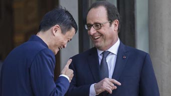 French President Francois Hollande (R) talks with Jack Ma, Chinese entrepreneur and founder of Alibaba Group, in Paris, France, on March 18, 2015.(Xinhua/Chen Xiaowei)