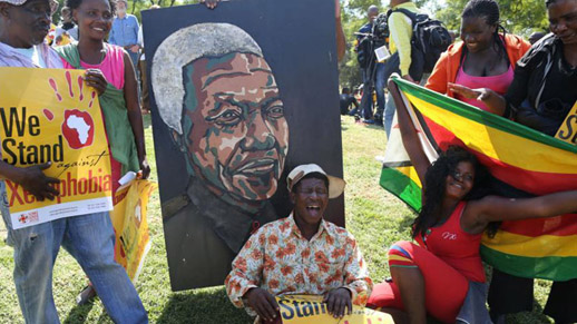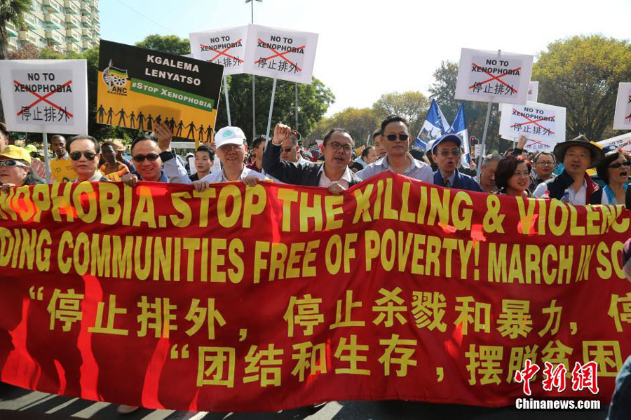 A number of Chinese nationals living in South Africa attend an anti-xenophobia protest, holding a huge banner reading "No to xenophobia. Stop the killing and violence" in Johannesburg, South Africa, on April 23, 2015. [Photo: Chinanews.com]