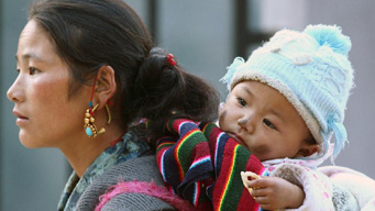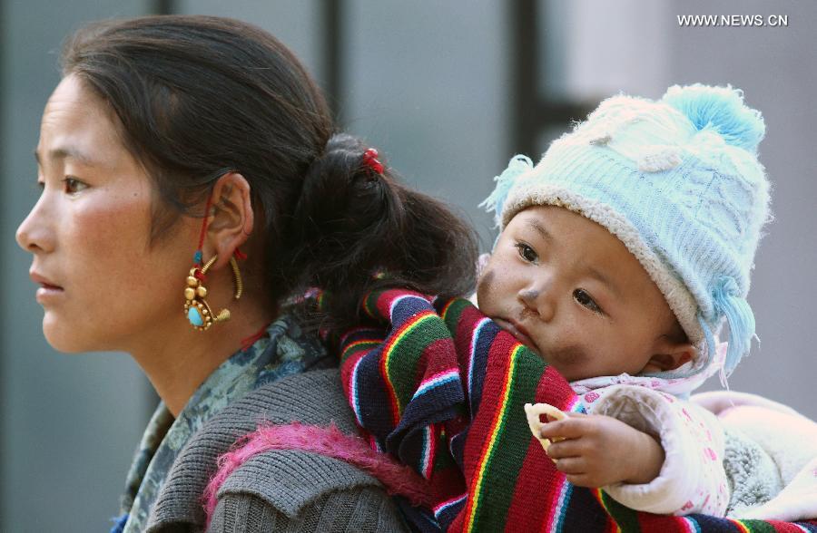 A villager carrying a baby prepares to evacuate from Jiangcun Village, Gyirong County, southwest China's Tibet Autonomous Region, May 14, 2015. A total of 52 people in Jiangcun Village were all transferred to safe place in Gyirong Town after the village was affected by the earthquake in Nepal on May 12. (Photo: Xinhua/Yin Gang)