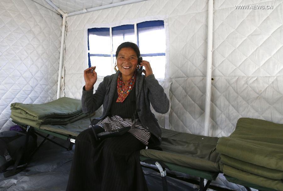 A villager calls her parents after being evacuated to Gyirong Town in Gyirong County, southwest China's Tibet Autonomous Region, May 14, 2015. A total of 52 people in Jiangcun Village were all transferred to safe place in Gyirong Town after the village was affected by the earthquake in Nepal on May 12. (Photo: Xinhua/Yin Gang)