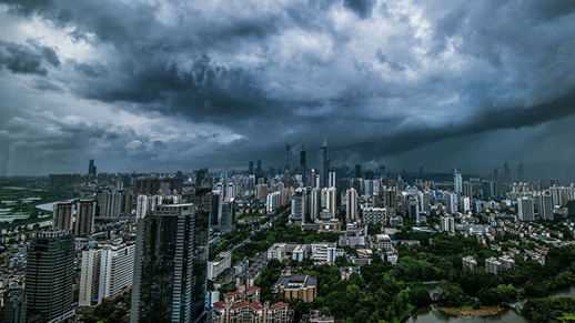 A giant thunderhead loomed over the city of Shenzhen during a rainstorm on May 20. The massive dark cloud hovered just above the city's skscrapers in an eerie scene that might call to mind visions of the end of the world. Shenzhen, a coastal city in south China and the country's first special economic zone, is located in southern Guangdong on the eastern bank of the Pearl River. [China.org.cn]